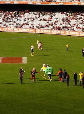 Friend or foe? Alex spectating. Warming up. Pre-game entertainment. Melbourne banner. Big entrance, small crowd. Kicking for goal. Lloyd getting ready. Mass confusion. Run-up. Jumpin' Post-game station crowd.